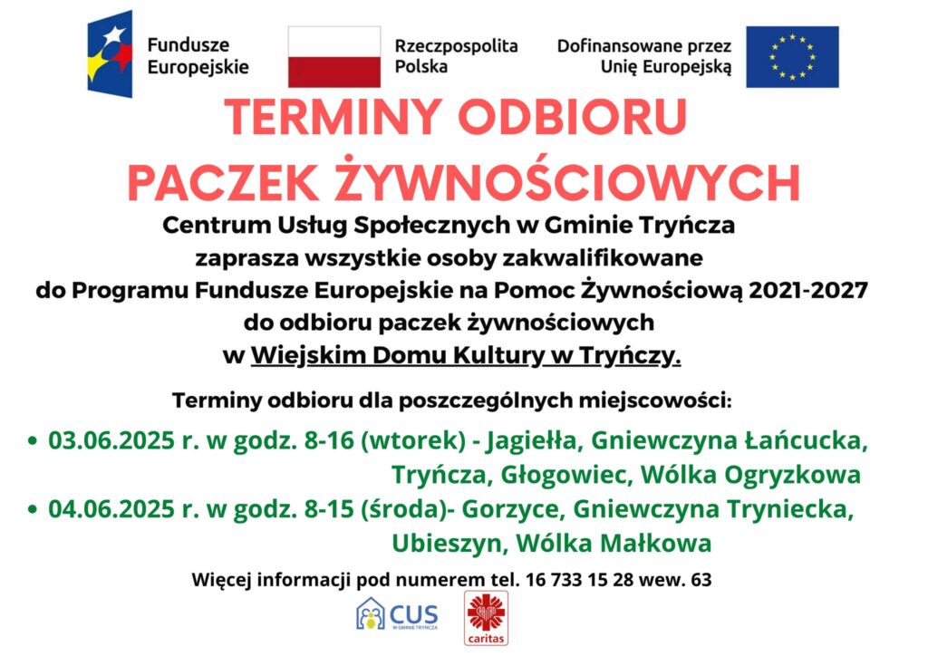 Centrum Usług Społecznych (CUS) w Gminie Tryńcza serdecznie zaprasza wszystkie osoby zakwalifikowane do Programu Fundusze Europejskie na Pomoc Żywnościową 2021-2027 do odbioru paczek żywnościowych. Pomoc będzie wydawana w Wiejskim Domu Kultury w Tryńczy.