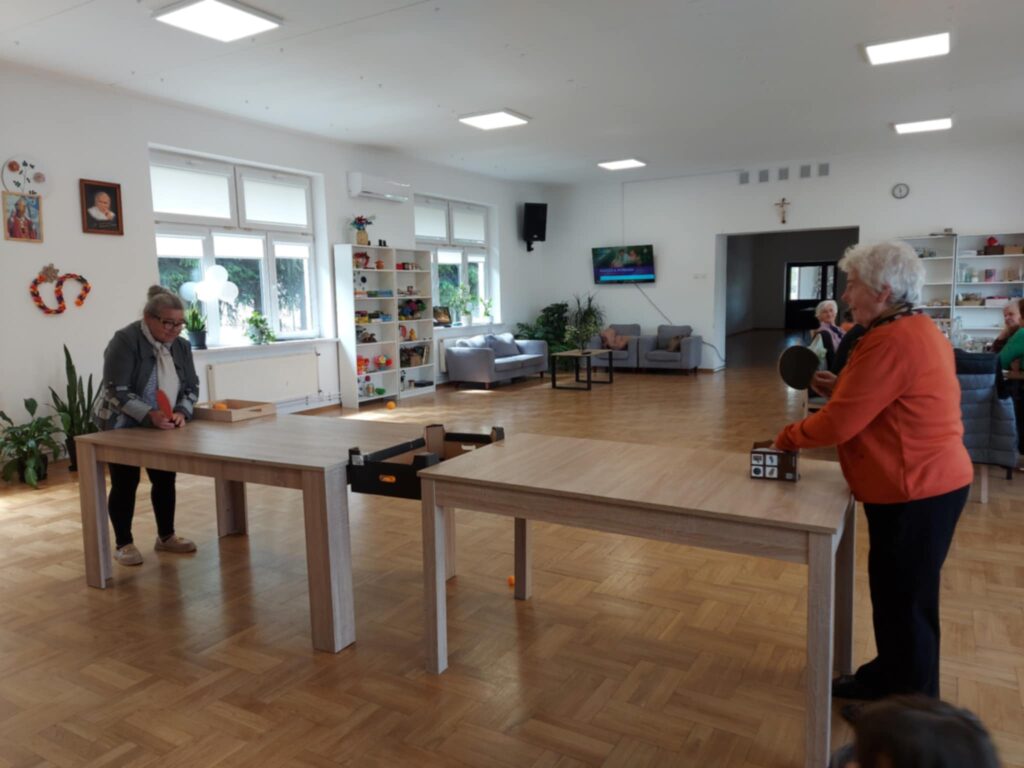 Nie zabrakło również aktywności artystycznych – klubowicze z zapałem tworzyli kolorowe, abstrakcyjne obrazy, wykorzystując do tego sznurek i farby. Codziennością w klubie są także zabawy ruchowe oraz treningi pamięci, takie jak rozwiązywanie łamigłówek, krzyżówek czy popularna gra „państwa-miasta”, które pomagają utrzymać sprawność umysłową i fizyczną.