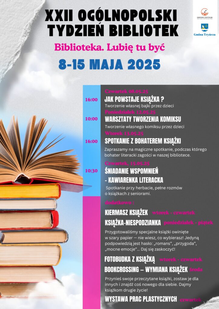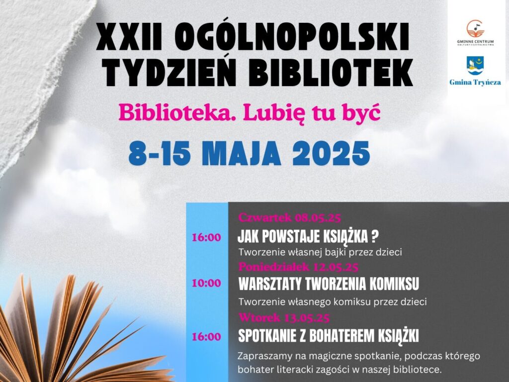 Gmina Tryńcza zaprasza na XXII Ogólnopolski Tydzień Bibliotek, który potrwa od 8 do 15 maja 2025 roku! Przed nami tydzień pełen literackich emocji, kreatywności i niespodzianek!