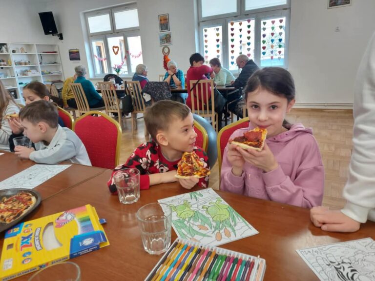 Podczas dzisiejszych zajęć w ramach ferii dzieci i seniorzy mieli okazję rozwijać swoje zdolności kulinarne w robieniu pizzy. Uczestnicy własnoręcznie przygotowali ciasto na pizzę oraz wybrali do niej składniki według swoich smaków: szynka, salami, oliwki czy podwójny ser. Własnoręcznie zrobiona
