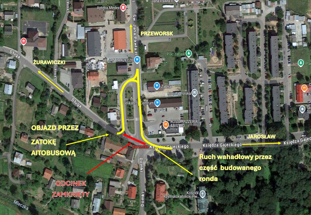 Objazd został wyznaczony przez zatokę autobusową oraz przez odcinek nowo budowanego ronda, na którym obowiązywać będzie ruch wahadłowy. Prosimy o stosowanie się do sygnalizacji świetlnej i tymczasowego oznakowania.