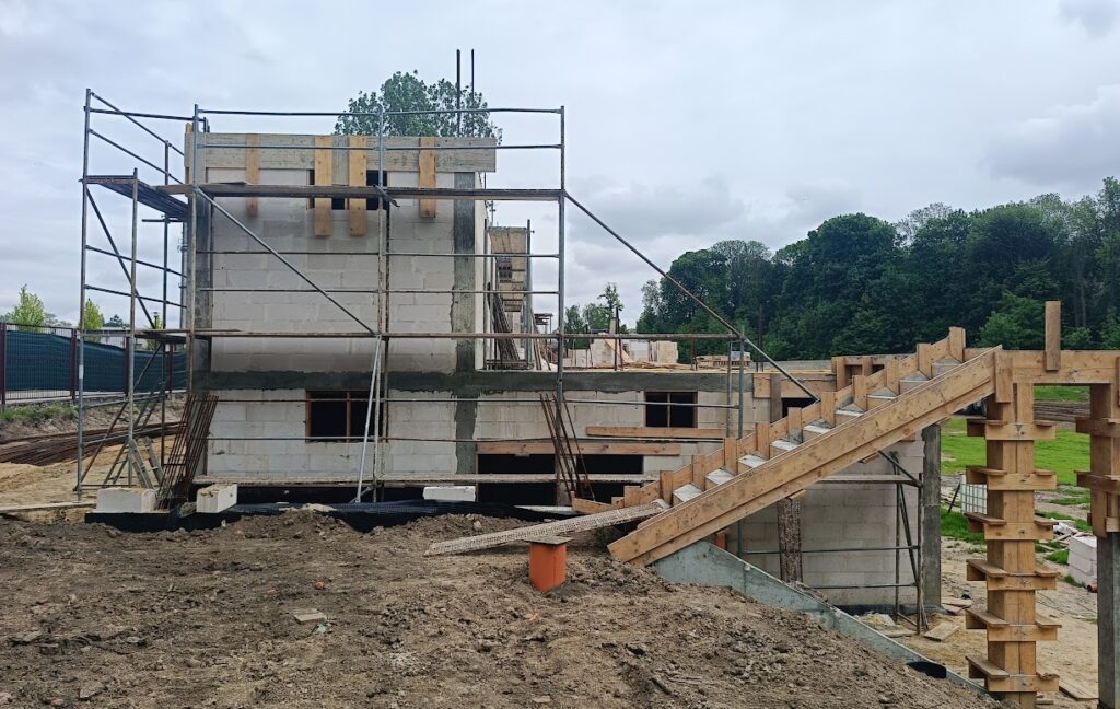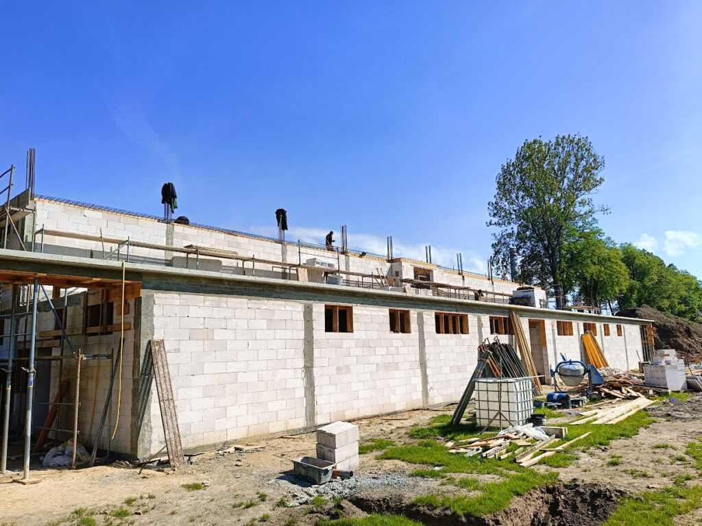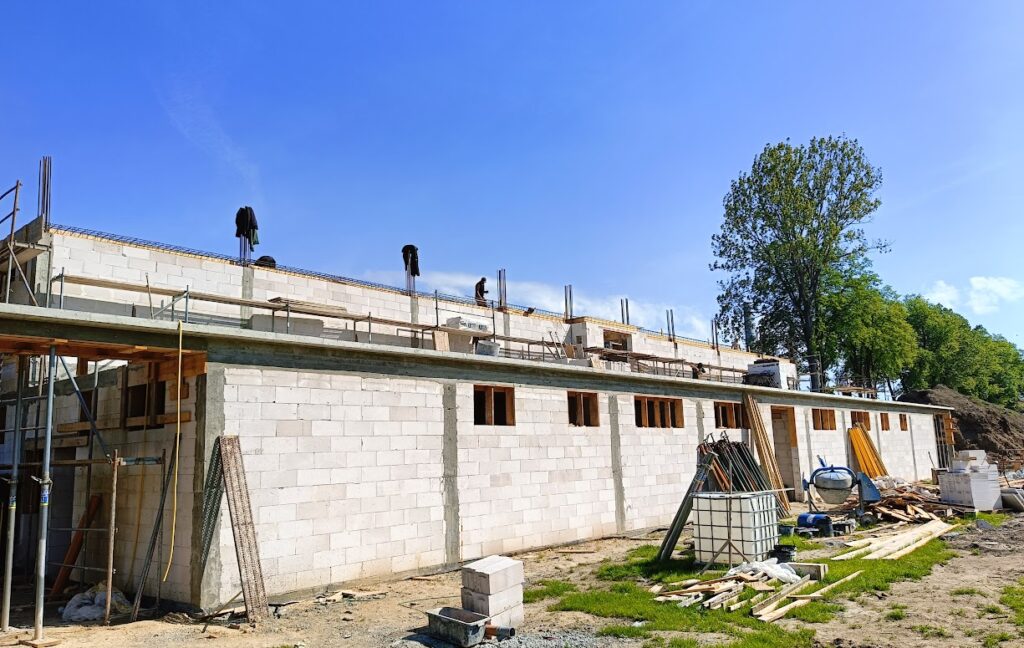 Kwiecień był kolejnym miesiącem intensywnych prac. Zakończono wznoszenie ścian budynku szatniowego, nad którym powstaje zadaszona trybuna, która pomieści 300 kibiców! Obecnie trwają prace zbrojeniowe przed wylaniem drugiego stropu – to właśnie na nim zostanie zamontowany dach trybuny.