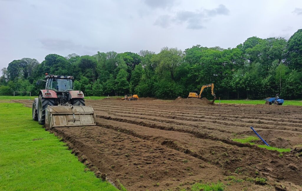 Równocześnie rozpoczęły się roboty ziemne związane z przygotowaniem podłoża pod nową murawę boiska piłkarskiego. Na teren inwestycji dotarły już także ogromne zbiorniki, które będą gromadzić wodę z drenażu – ta woda posłuży do nawadniania przyszłej, zielonej płyty boiska.