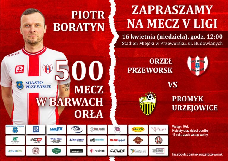 Zarząd, działacze i piłkarze MKS Orzeł Przeworsk pragną bardzo serdecznie podziękować wszystkim Kibicom którzy przybyli na Jubileuszowe spotkanie, mecz numer 500 naszego zawodnika Piotra Boratyna. Szczególne podziękowania składamy Kibicom za frekwencję w tym wyjątkowym niedzielnym meczu z Promykiem, gdzie mecz