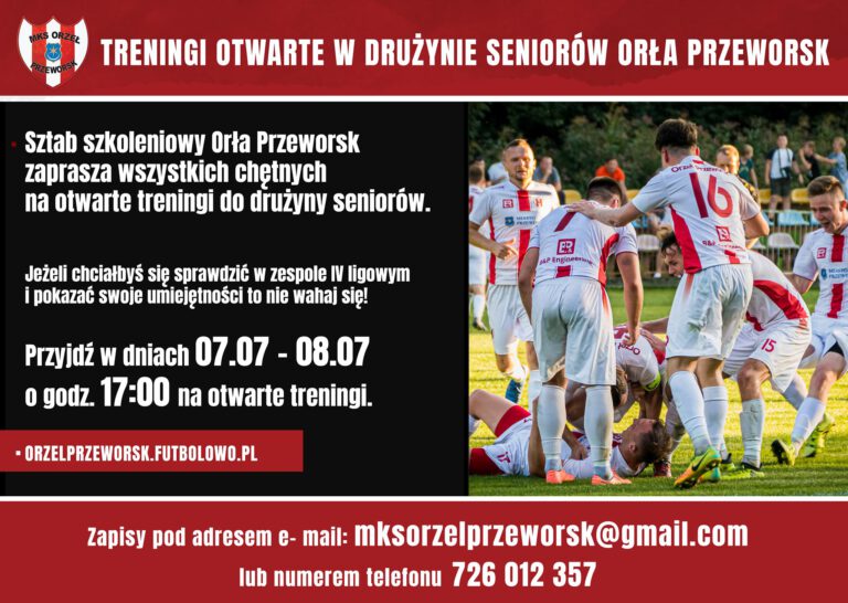 Sztab szkoleniowy Orła Przeworsk zaprasza wszystkich chętnych na otwarte treningi do drużyny seniorów. Jeżeli chciałbyś się sprawdzić w zespole IV ligowym i pokazać swoje umiejętności to nie wahaj się i przyjdź w dniach 07 – 08.07 o godz.17.00 na otwarte