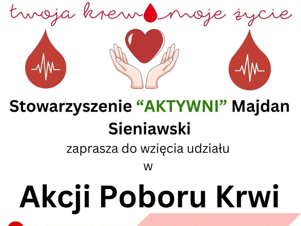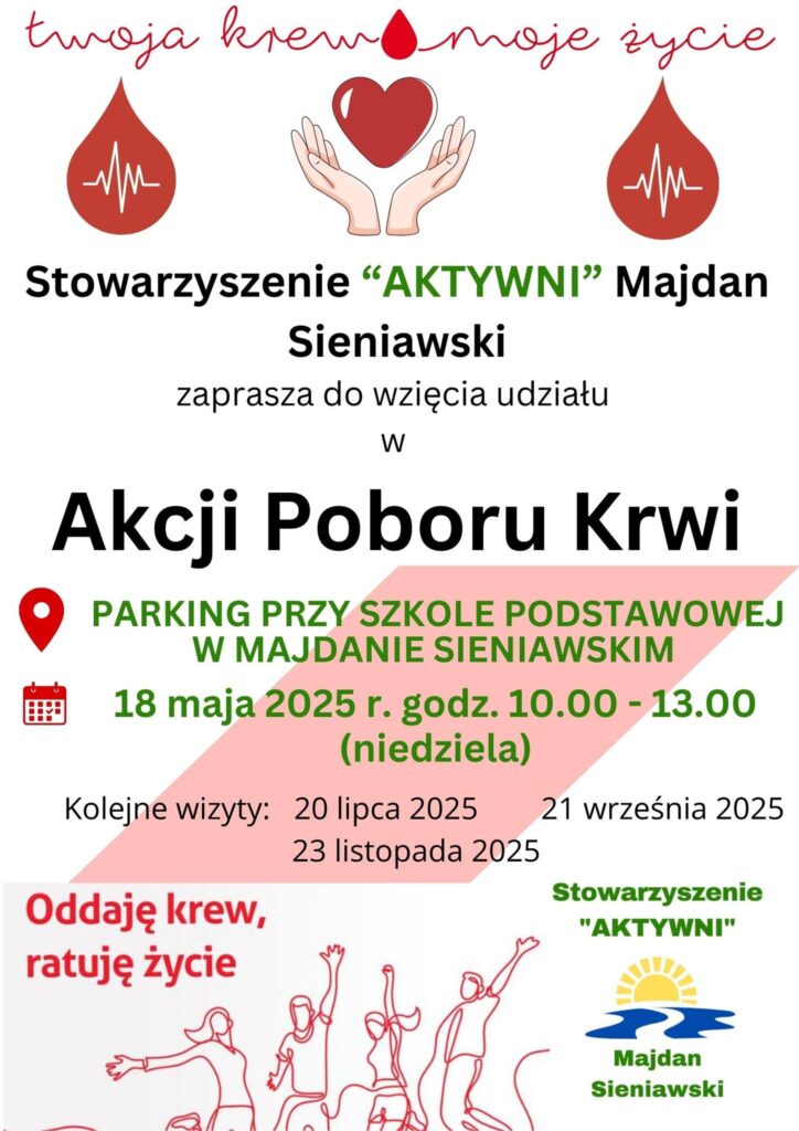 Stowarzyszenie „AKTYWNI” Majdan Sieniawski serdecznie zaprasza do wzięcia udziału w Akcji Poboru Krwi, która odbędzie się 18 maja 2025 roku (niedziela) na parkingu przy Szkole Podstawowej w Majdanie Sieniawskim, w godzinach 10:00 – 13:00.