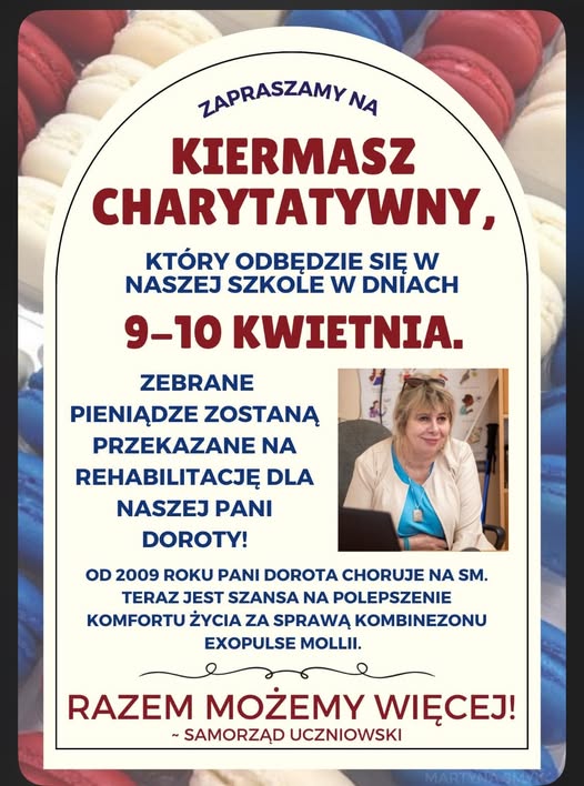 Pani Dorota od lat zmaga się z tą nieuleczalną chorobą, a obecnie pojawiła się szansa na poprawę komfortu jej życia dzięki specjalistycznemu kombinezonowi Exopulse Mollii. Uczniowie, pod hasłem „Razem możemy więcej!”, postanowili zorganizować kiermasz, aby zebrać fundusze na ten cel.