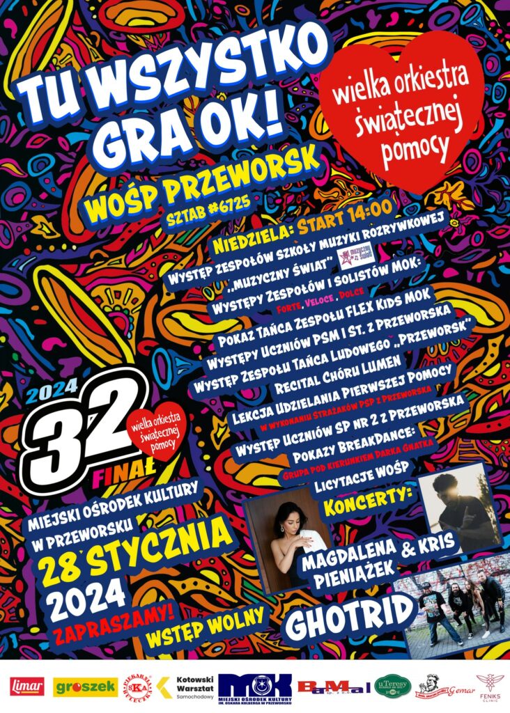 Sztab WOŚP z Przeworska nr 6725 działający przy Miejskim Ośrodku Kultury im. Oskara Kolberga w Przeworsku ma przyjemność zaprosić na Finałowy koncert, który odbędzie się 28 stycznia 2024 roku od godz. 14:00 w sali widowiskowej MOK. Tegorocznym celem zbiórki jest zebranie funduszy które zostaną przeznaczone na zakup sprzętu do diagnozowania, monitorowania i rehabilitacji chorób płuc pacjentów na oddziałach pulmonologicznych dla dzieci i dorosłych. Fundacja planuje zakupić urządzenia do diagnostyki obrazowej, diagnostyki czynnościowej, diagnostyki endoskopowej, rehabilitacji oraz torakochirgurgii.