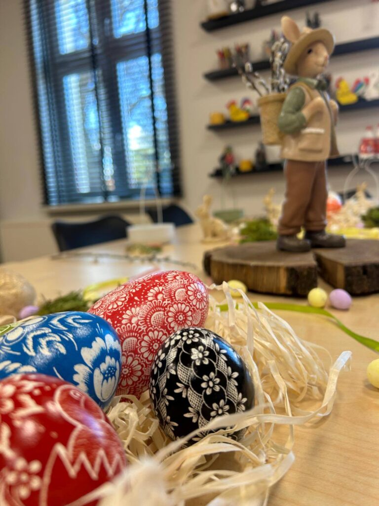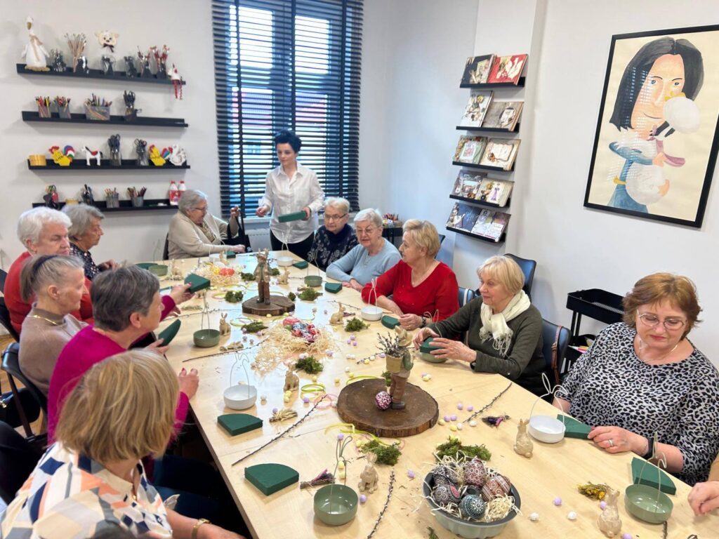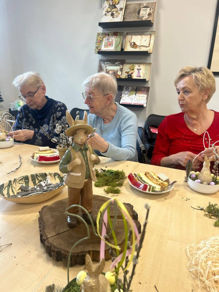Jednak to nie tylko praca manualna wypełniła czas spotkania. Najcenniejszym elementem była wymiana wspomnień i opowieści o wielkanocnych tradycjach, które są żywe w ich domach od pokoleń. Każda z Pań dzieliła się unikalnymi zwyczajami, anegdotami i przepisami, tworząc tym samym bogatą mozaikę lokalnych tradycji. To pełne ciepła i wzruszeń chwile dostarczyły wszystkim wiele radości i wywołały niejedną salwę śmiechu.
