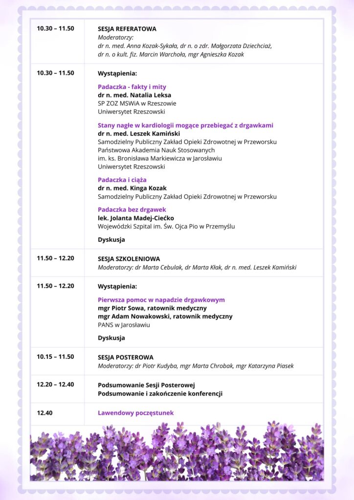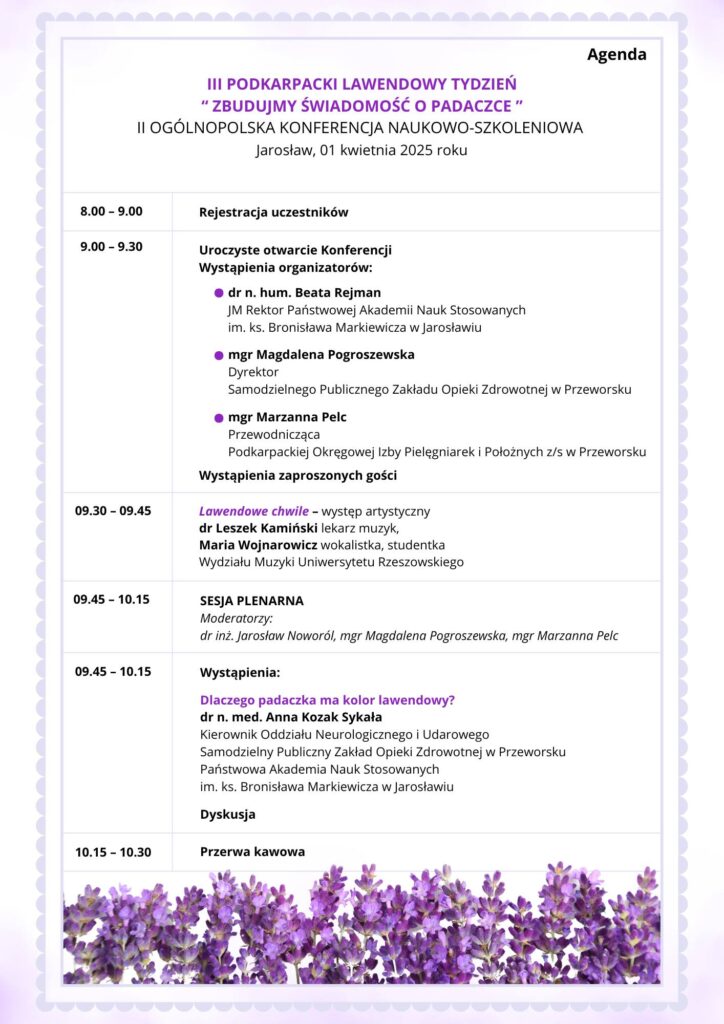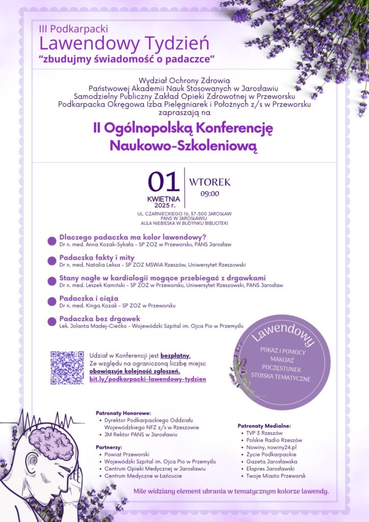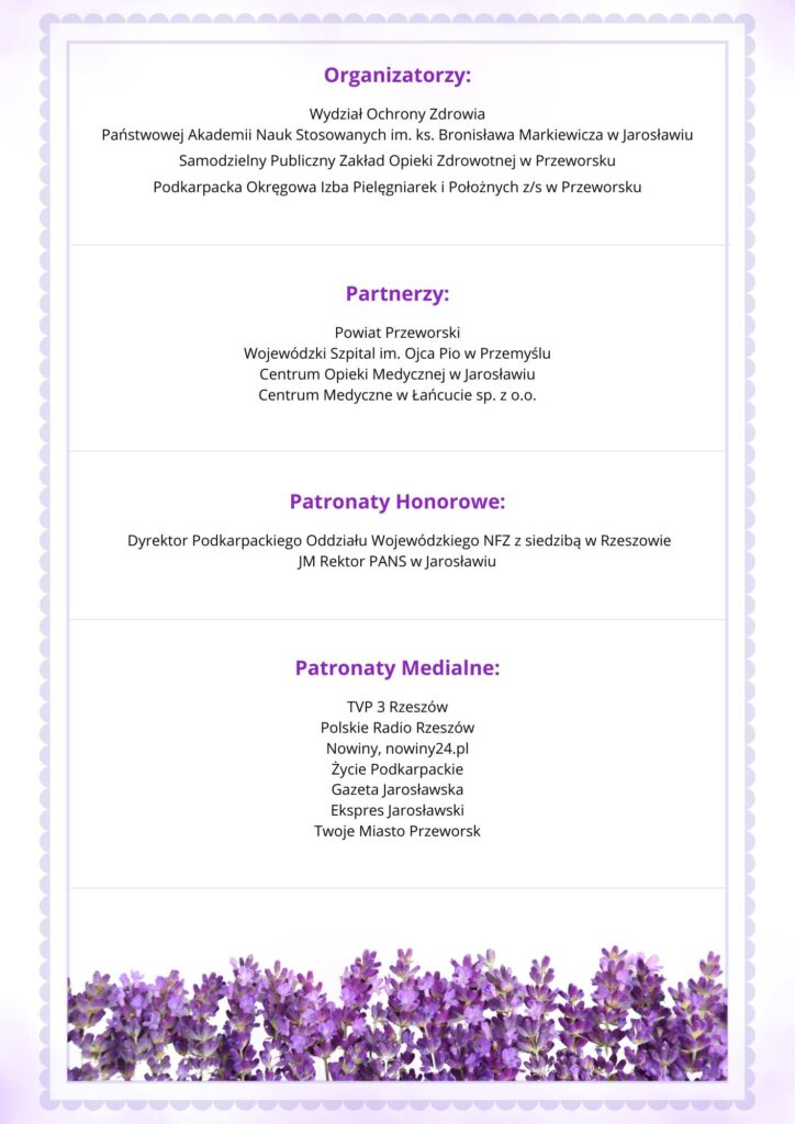 Samodzielny Publiczny Zakład Opieki Zdrowotnej w Przeworsku serdecznie zaprasza do udziału w II Ogólnopolskiej Konferencji Naukowo-Szkoleniowej oraz III Podkarpackim Lawendowym Tygodniu, które odbędą się 1 kwietnia 2025 roku w Państwowej Akademii Nauk Stosowanych im. ks. Bronisława Markiewicza w Jarosławiu.
