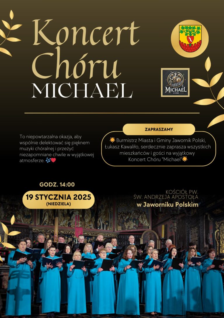 Zapraszamy na wyjątkowy Koncert Chóru „Michael”! Data: 19 stycznia 2025 r. (niedziela) Godzina: 14:00 Miejsce: Kościół w Jaworniku Polskim Wystąpi Chór „Michael”, który swoim śpiewem wprowadzi nas w atmosferę pełną wzruszeń i harmonii. Zaprasza:Łukasz Kawaliło – Burmistrz Miasta i Gminy