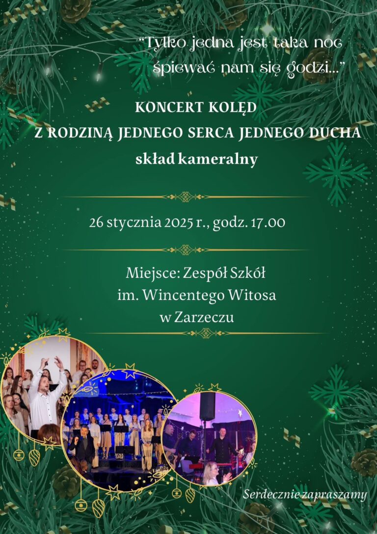 Serdecznie zapraszam na niezwykły wieczór pełen świątecznej muzyki. W niedzielę, 26 stycznia br. o godzinie 17:00 w Zespół Szkół im W. Witosa w Zarzeczu odbędzie się „Koncert Kolęd z Rodziną Jednego Serca Jednego Ducha w składzie kameralnym”. W tym dniu