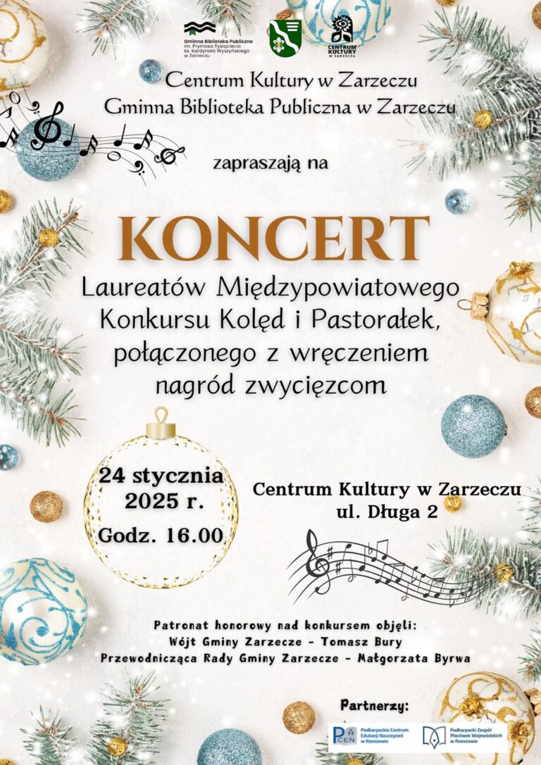 Drodzy Laureaci Międzypowiatowego Konkursu Kolęd i Pastorałek poniżej przedstawiamy listę osób występujących podczas koncertu w dniu 24 stycznia 2025 r. ZAPRASZAMY WSZYSTKICH 24 STYCZNIA NA GODZINĘ 16:00 DO CENTRUM KULTURY W ZARZECZU przy ul. Długiej 2 na koncert i rozdanie