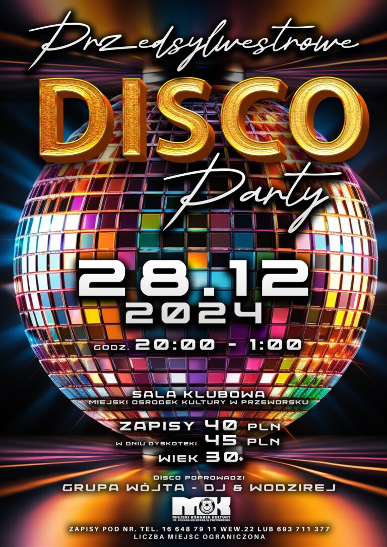 Kochani, przed nami wyjątkowa okazja, by wspólnie rozgrzać parkiet przed Sylwestrem! 28 grudnia 2024 roku spotykamy się na niezapomnianej imprezie, która odbędzie się w sali klubowej Miejskiego Ośrodka Kultury w Przeworsku. Startujemy o godzinie 20:00, a kończymy o 01:00 –