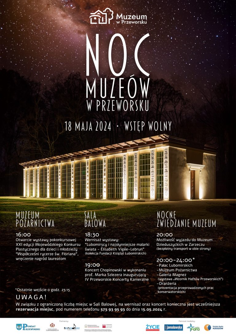 Muzeum w Przeworsku Zespół Pałacowo-Parkowy, Instytucja Kultury Powiatu Przeworskiego zaprasza na NOC MUZEÓW w dniu 18 maja (sobota) 2024 roku. !!! WSTĘP WOLNY !!! W programie: Muzeum Pożarnictwa 16:00: otwarcie wystawy pokonkursowej XXI edycji Wojewódzkiego Konkursu Plastycznego dla dzieci i