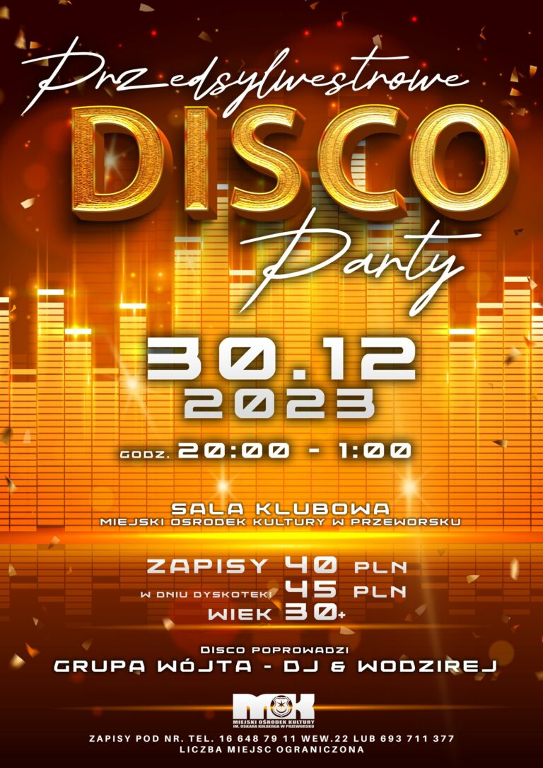 Przygotuj się na taneczne wejście w Nowy Rok z dyskotekową imprezą jak żadna inna! Rozpocznijmy świętowanie dzień wcześniej! Przedsylwestrowe DISCO Party! Dołącz do nas w noc przed sylwestrem i przeżyj imprezę pełną pulsujących bitów, olśniewających świateł i nieprzerwanej akcji na