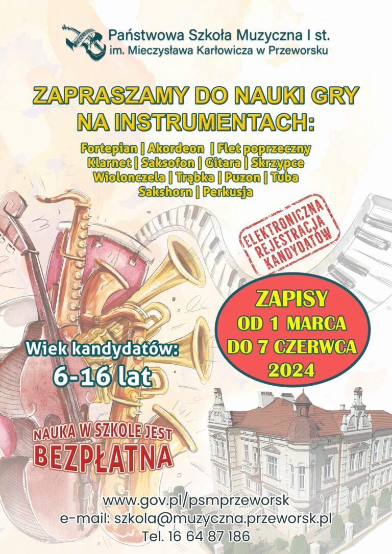 Państwowa Szkoła Muzyczna I Stopnia w Przeworsku ZAPRASZA DO NAUKI GRY NA INSTRUMENTACH: Fortepian | Akordeon | Flet poprzeczny | Klarnet | Saksofon | Gitara | Skrzypce | Wiolonczela | Trąbka | Puzon | Tuba Sakshorn | Perkusja Wiek kandydatów: