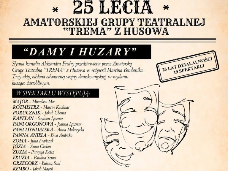 W minioną niedzielę, 30 marca 2025 roku, Husów stał się świadkiem wyjątkowego wydarzenia – jubileuszu 25-lecia Amatorskiej Grupy Teatralnej „TREMA”. Z tej okazji artyści zaprezentowali spektakl „Damy i Huzary” Aleksandra Fredry, w reżyserii Marcina Bembenika. Sala teatralna CKGM oddział w