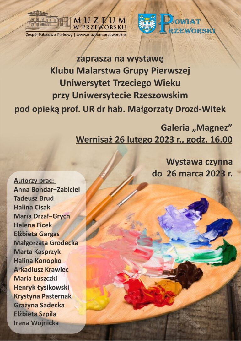 Muzeum w Przeworsku zaprasza na wernisaż wystawy KLUBU MALARSTWA Grupy Pierwszej Uniwersytetu Trzeciego Wieku przy Uniwersytecie Rzeszowskim pod opieką dr hab. Małgorzaty Drozd-Witek – prof. UR Instytut Sztuk Pięknych Galeria Magnez, 26 lutego 2023 r. (niedziela), godz. 16.00 Uczestnicy: Anna