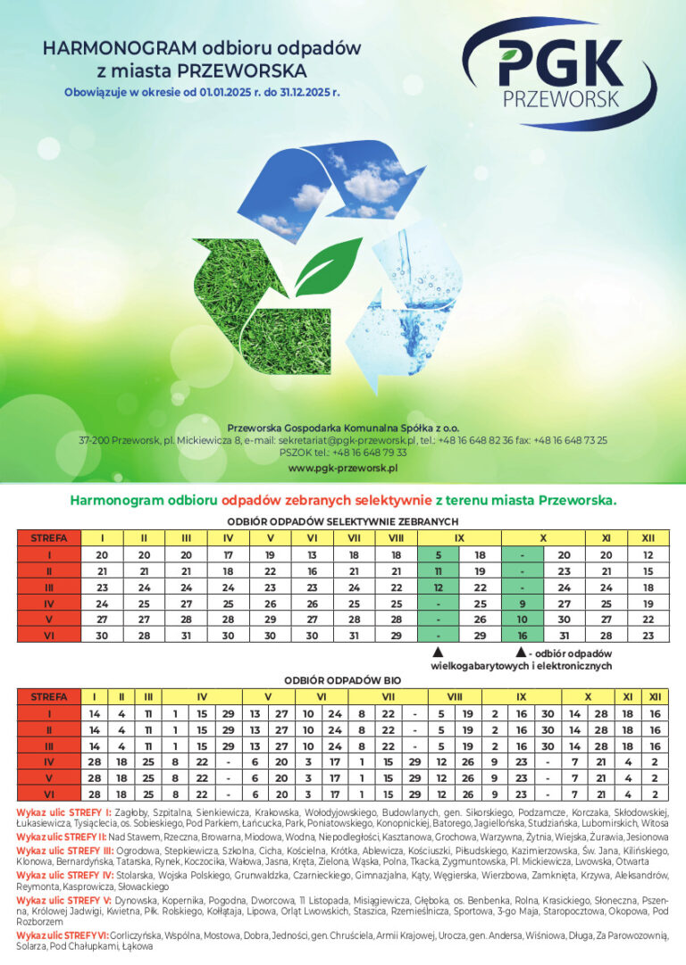 Harmonogram odbioru odpadów z miasta Przeworsk w 2025 roku. Do pobrania: harmonogram odbioru odpadów .pdf Źródło: PGK Przeworsk