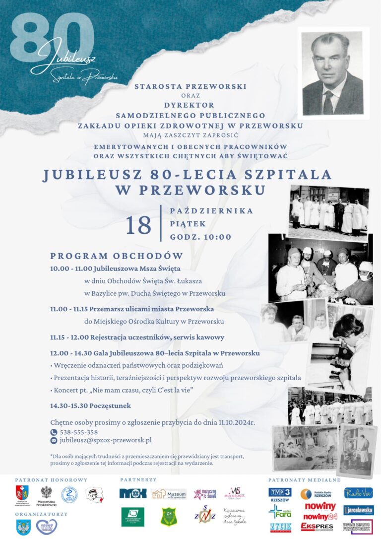 Starosta Przeworski oraz Dyrektor Samodzielnego Publicznego Zakładu Opieki Zdrowotnej w Przeworsku mają zaszczyt zaprosić emerytowanych i obecnych pracowników oraz wszystkich chętnych na uroczystość z okazji: JUBILEUSZU 80-LECIA SZPITALA W PRZEWORSKU Już 18 października, o godzinie 10:00. Zapraszamy serdecznie! Przypominamy osoby