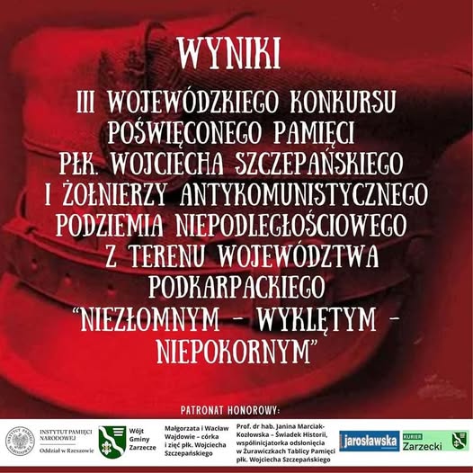 Z radością ogłaszamy Laureatów III WOJEWÓDZKIEGO KONKURSU POŚWIĘCONEGO PAMIĘCI PŁK. WOJCIECHA SZCZEPAŃSKIEGO I ŻOŁNIERZY ANTYKOMUNISTYCZNEGO PODZIEMIA NIEPODLEGŁOŚCIOWEGO Z TERENU WOJEWÓDZTWA PODKARPACKIEGO! Komisje konkursowe po wnikliwej analizie prac postanowiły przyznać następujące nagrody i wyróżnienia: I KATEGORIA: praca plastyczna I MIEJSCE: II