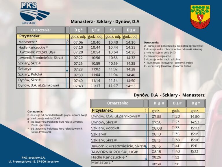 Dobra wiadomość dla mieszkańców! PKS Jarosław uruchamia nowe połączenia na trasie Manasterz – Dynów! Dzięki wielomiesięcznym rozmowom i staraniom Burmistrza Miasta i Gminy Jawornik Polski, Łukasz Kawaliło, oraz dofinansowaniu udzielonemu przez Radę Miejską, udało się nawiązać współpracę z PKS Jarosław,