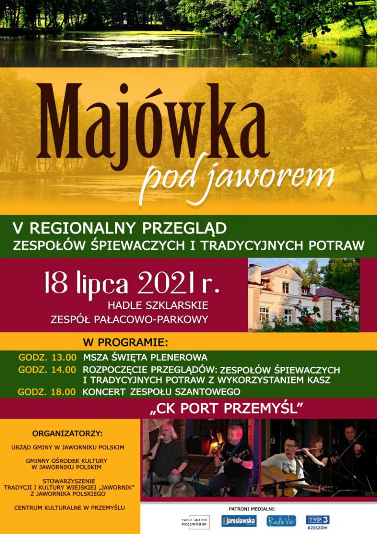 18 lipca 2021 r. o godz. 14.00 zapraszamy do Hadli Szklarskich na Majówkę pod jaworem. V Regionalny Przegląd Zespołów Śpiewaczych i Tradycyjnych Potraw. Przegląd poprzedzi Msza św. plenerowa, która rozpocznie się o godz. 13.00, zaś zakończy gościnny koncert zespołu szantowego