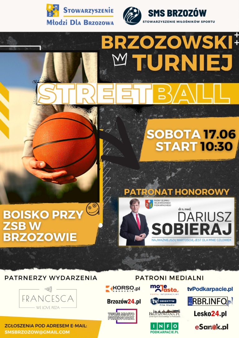 Niezmiernie miło nam poinformować o objęciu patronatem medialnym przez gazetę Twoje Miasto Przeworsk wydarzenia sportowego: „Brzozowski Turniej Streetball”. Impreza pod Patronatem Honorowym Pana dr Dariusza Sobieraja – Radnego Sejmiku Województwa Podkarpackiego odbędzie się już 17 czerwca 2023r., o godzinie 10:30