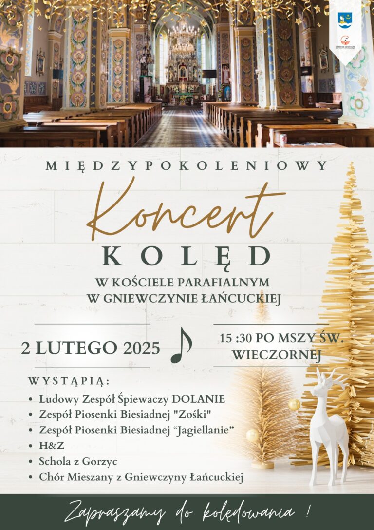 Serdecznie zapraszamy na wyjątkowy Międzypokoleniowy Koncert Kolęd, który odbędzie się 2 lutego 2025 roku o godz. 15:30 (po mszy świętej) w kościele parafialnym pw. św. Mateusza w Gniewczynie Łańcuckiej. Koncert odbędzie się po mszy świętej, a w magiczny, świąteczny nastrój