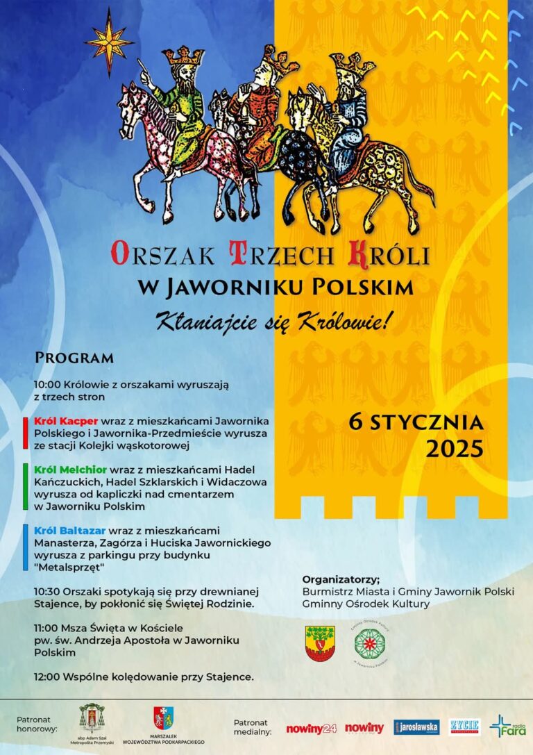 Burmistrz Miasta i Gminy Jawornik Polski Łukasz Kawaliło i Gminny Ośrodek Kultury serdecznie zapraszają na I Orszak Trzech Króli w Jaworniku Polskim. 6 stycznia 2025 roku wyruszymy z trzech miejsc (szczegóły znajdują się na plakacie), aby się spotkać na Rynku