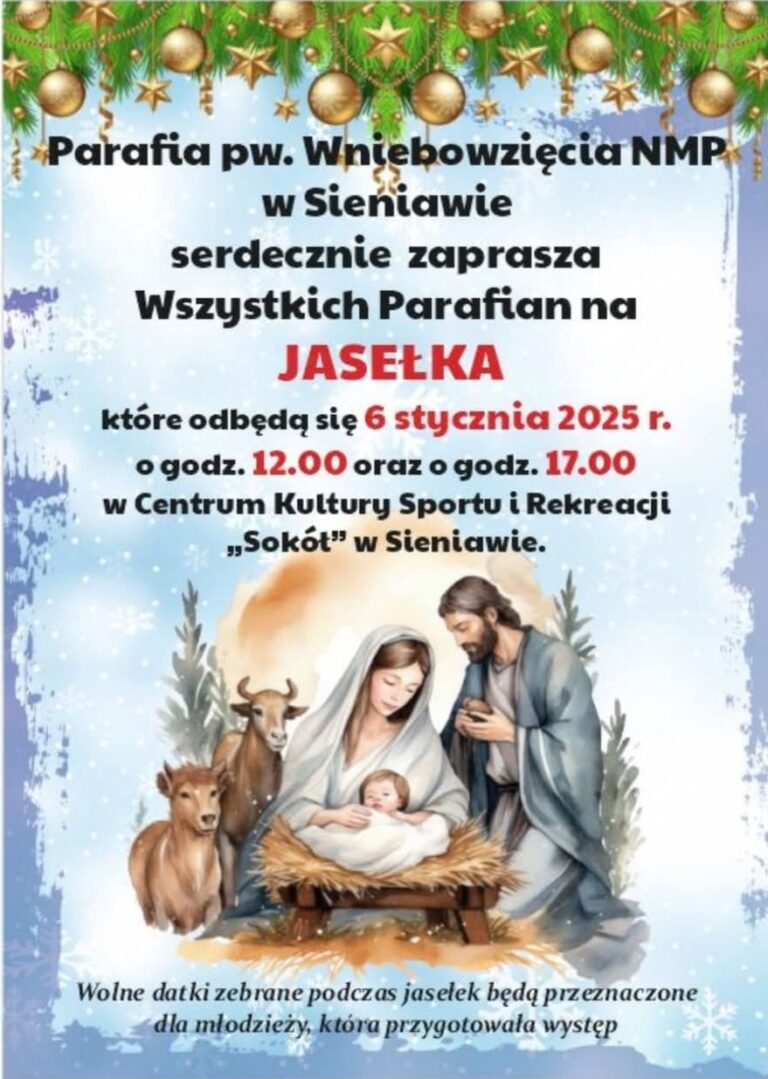 Jasełka parafialne – 6 stycznia, godz. 12.00 i 17.00, sala widowiskowa CKSiR „Sokół” w Sieniawie Źródło: CKSiR Sieniawa