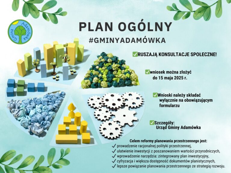 Mieszkańcy Gminy Adamówka! Macie realny wpływ na przyszły kształt naszej gminy! Trwa konsultacja projektu Planu Ogólnego oraz Prognozy Oddziaływania na Środowisko. Do 15 maja 2025 roku każdy zainteresowany ma możliwość składania wniosków i uwag do tych ważnych dokumentów planistycznych. To